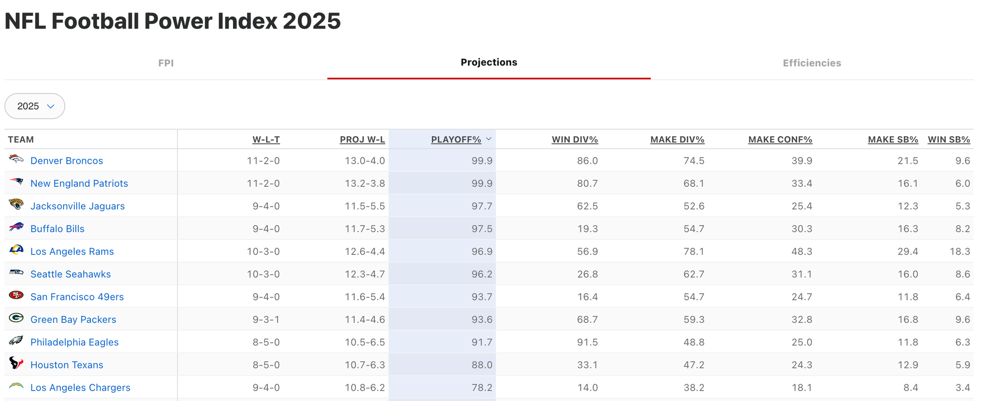 Their 10,000 simulations of the rest of the season project the Broncos to be the AFC's top dog. And they make many projections, so let's quickly go through them all.