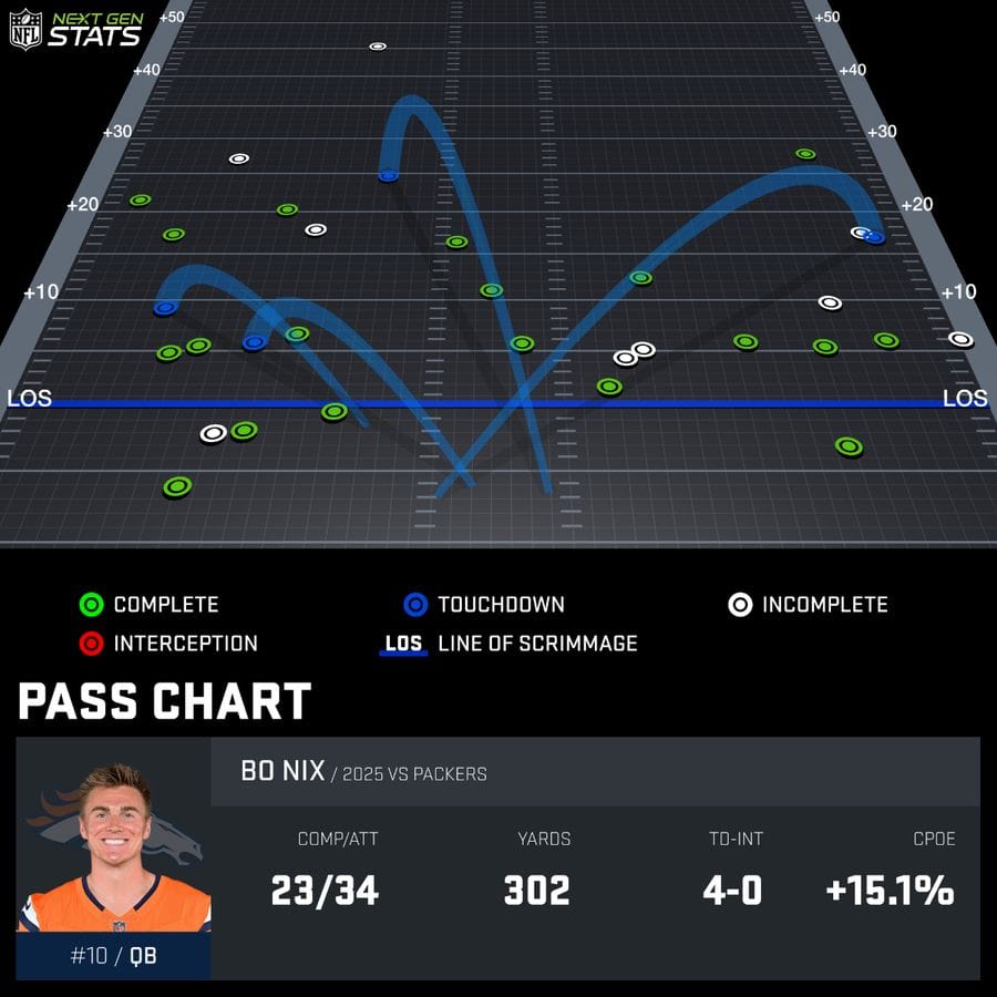 Coming into Sunday's game, Benjamin Solak said on Mina Kimes' podcast that he was picking the Packers for a few reasons. Namely, Jordan Love is great against man defense and the Broncos play a ton of man. And, conversely, Bo Nix is bad against the zone and Green Bay's defense plays a lot of zone.