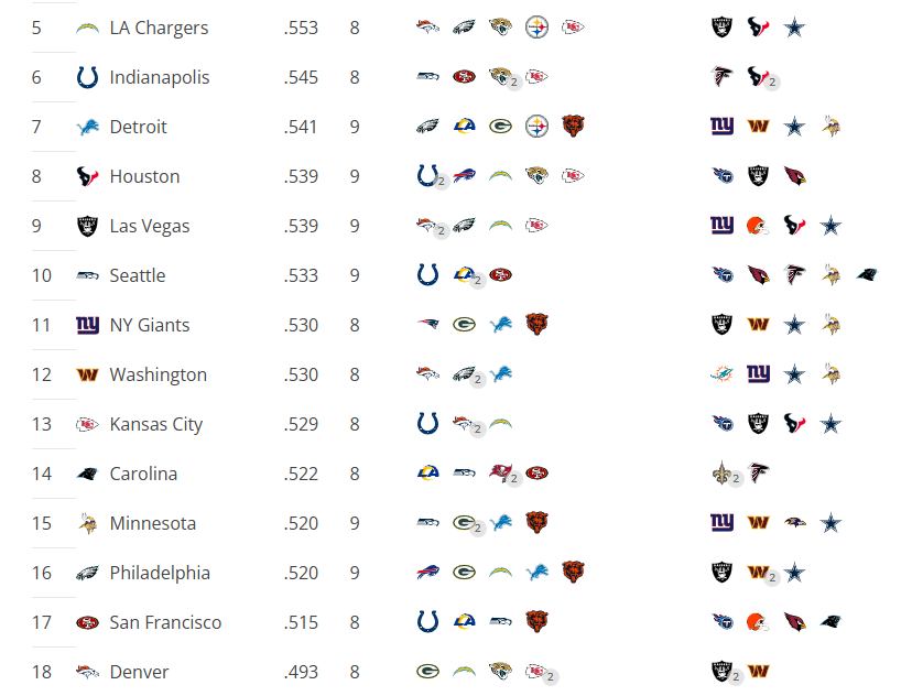 Broncos remaining strength of schedule is 18th per Tankathon. That's the easiest between the AFC West contenders. The Chargers play the fifth-toughest schedule while the Chiefs' remaining slate is 13th-hardest.